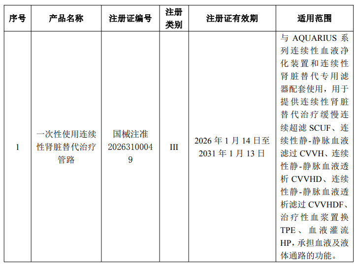 该产品由多种管路和附件组成,适用于与AQUARIUS系列连续性血液净化装置和专用滤器配套使用,承担血液及液体通路的功能。此次注册证的获得,标志着公司产品持续符合相关监管要求,有助于巩固和扩大市场竞争力。