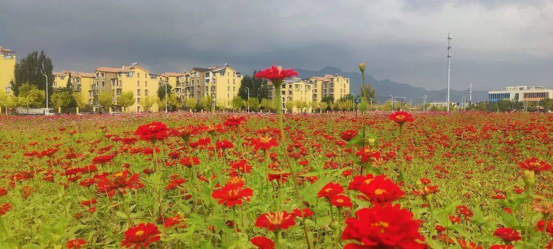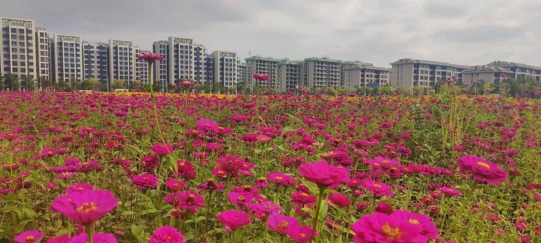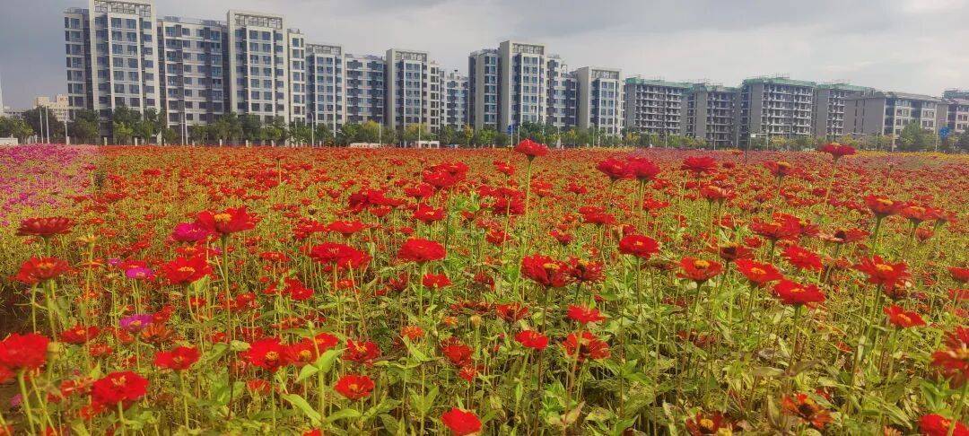 r花海依偎着小区,背后是错落的楼房,远处还有山峦隐约。城市的建筑与自然的花田在此交融,自然和谐。站在这片花海边上,心仿佛也被染上了缤纷的色彩,所有疲惫都被这蓬勃的生机驱散,只余下对这美好景致的沉醉与赞叹。